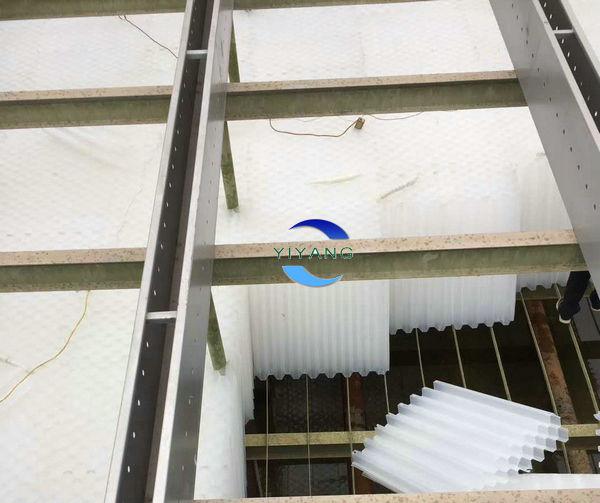 4、蜂窩斜管填料池內(nèi)組裝:將燙接后的填料單元在填料支架上部自左向右進(jìn)行組裝。保持60°角不變,每一單元順序組裝時要適當(dāng)壓緊,組裝到右側(cè)時若尺寸不是正合適,需要根據(jù)尺寸用散片蜂窩斜管填料燙接后進(jìn)行組裝直至全部到位。